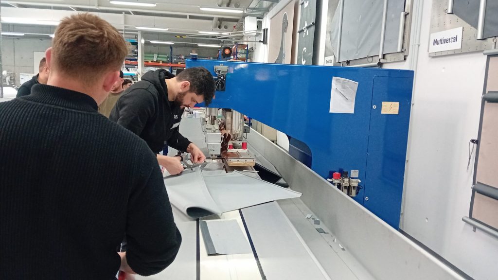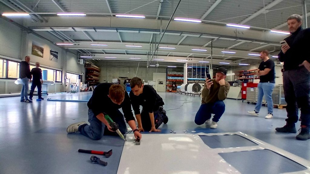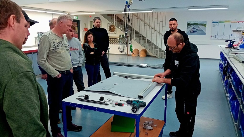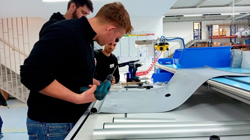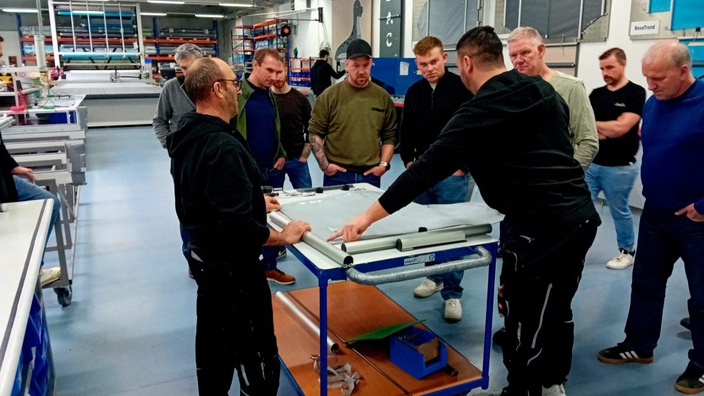 Am Vormittag noch Kennzahlen, Normen, Energieeffizienz. Am Nachmittag stehen die Teilnehmer zwischen Zuschnitt, Näherei und Montage. Material wird angefasst, Quetschrohre erklärt, Befestigungen getestet. Man spricht über Randauflagen, Sonderformen, Schneelasten. Aus Katalogen werden greifbare Systeme.