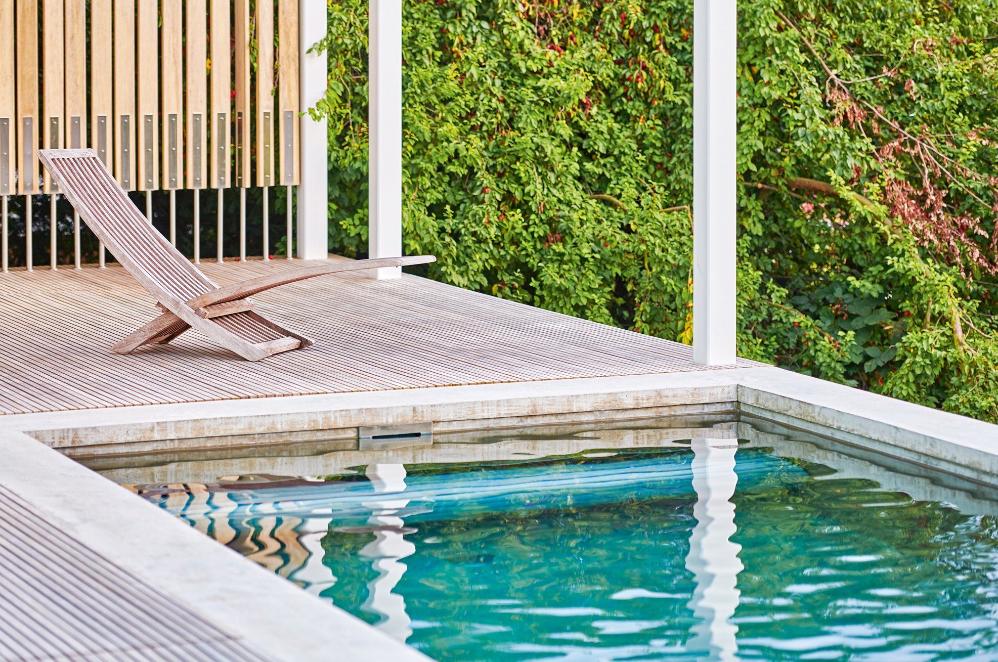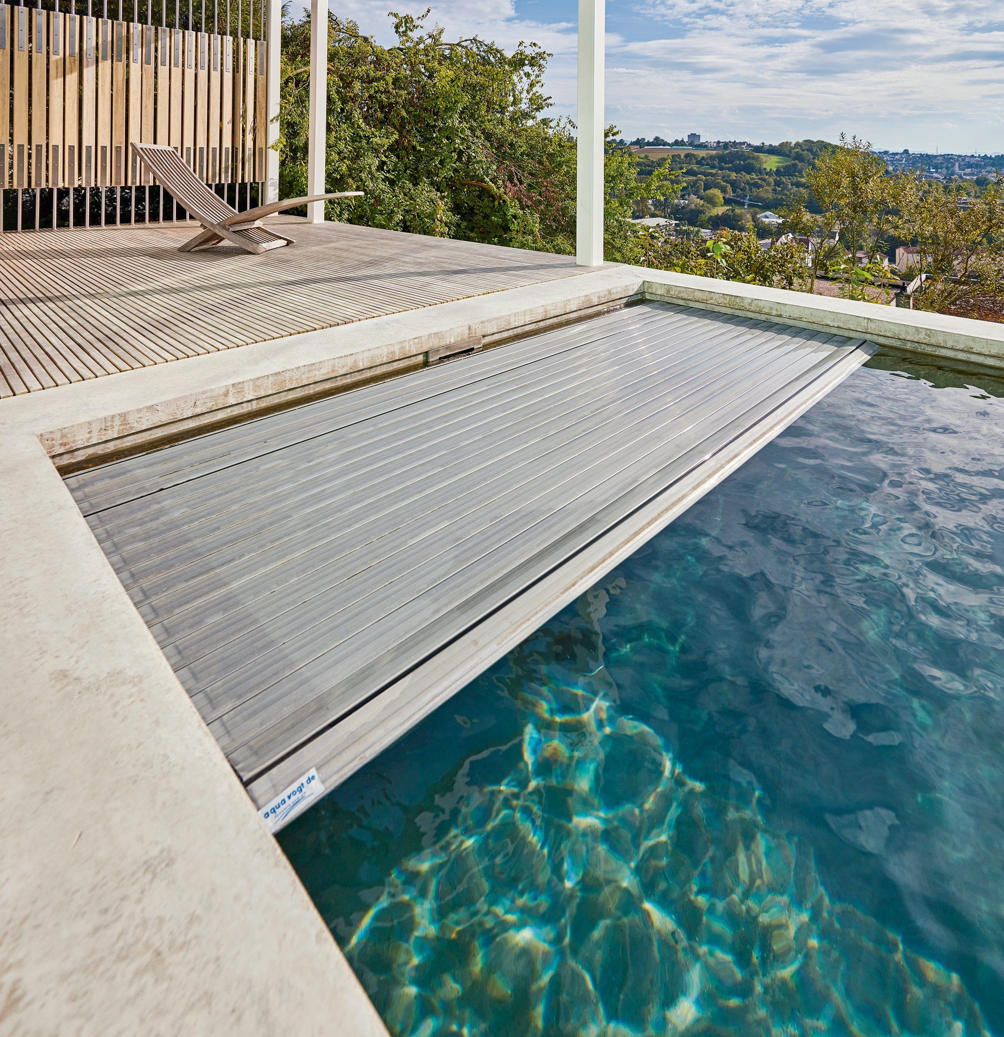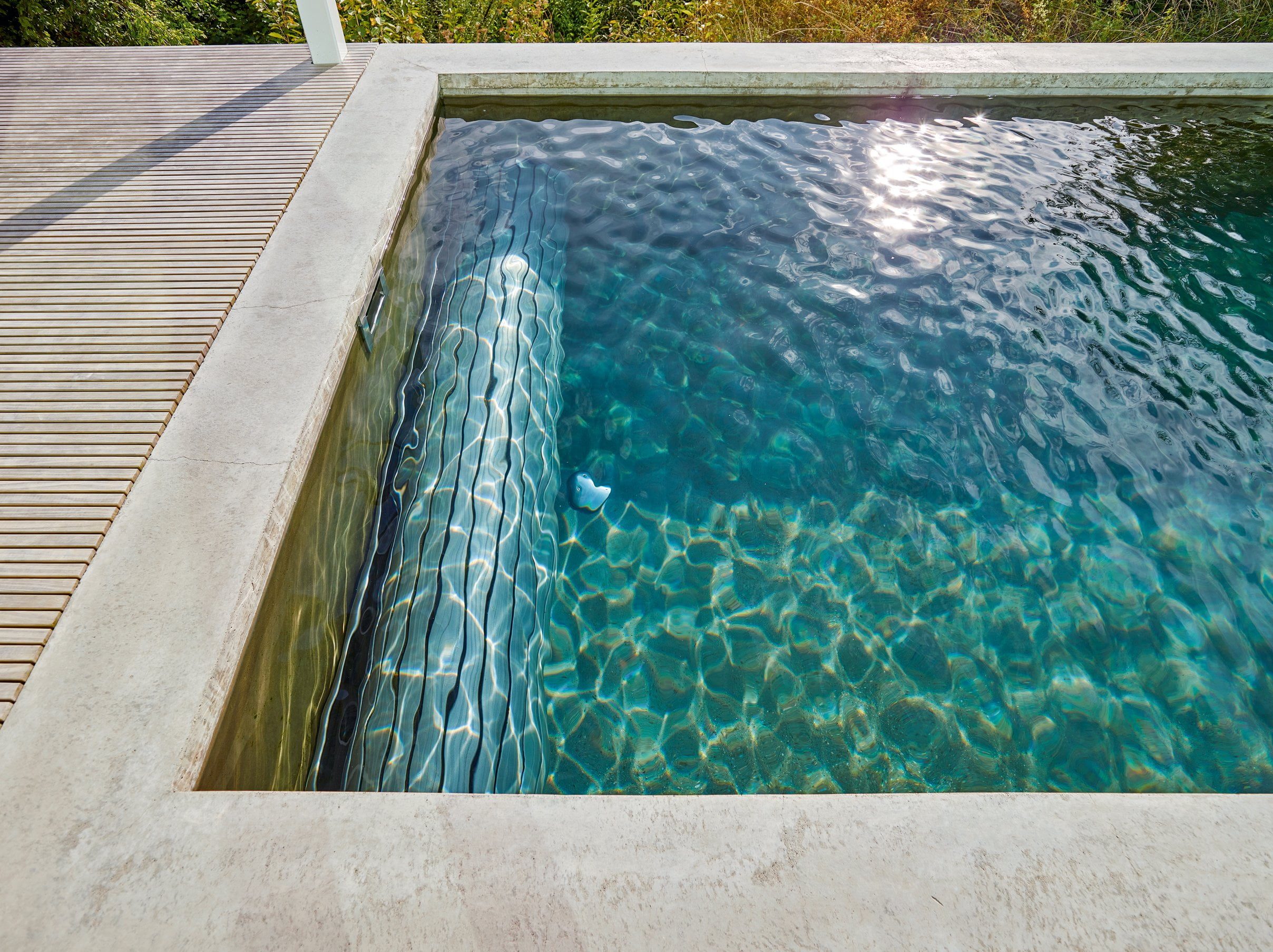 Die architektonische Formensprache ist dabei ebenso gut abgestimmt wie die Wahl hochwertiger Materialien. Zum Beispiel den energiebewussten Solar-Unterflurrollladen: Er trägt zur Beheizung des Beckens bei und schützt zudem vor Verunreinigungen. Oder die fünfstufige, einseitig gelagerte Einstiegstreppe aus Edelstahl – eine Eigenentwicklung der Firma Aquanalis