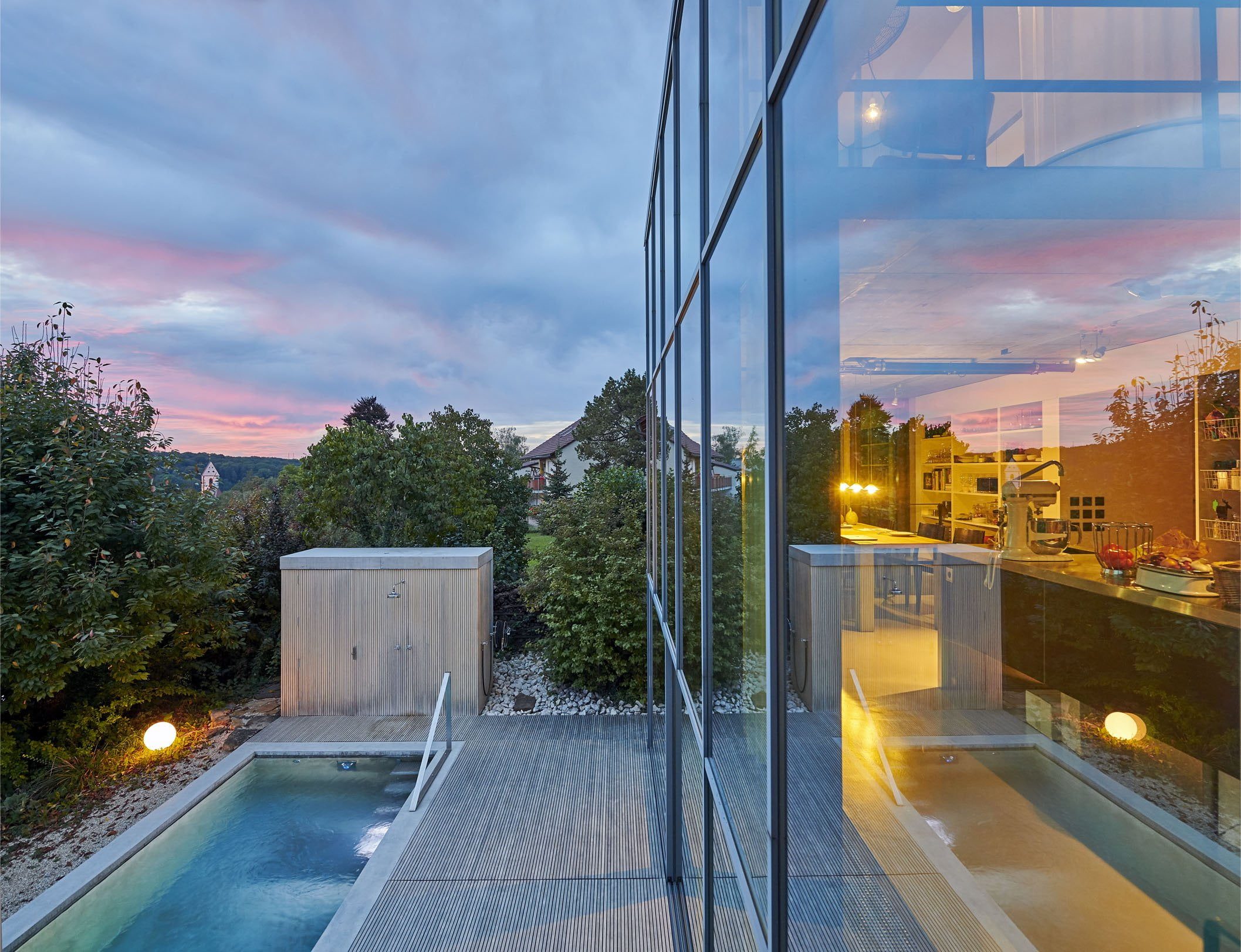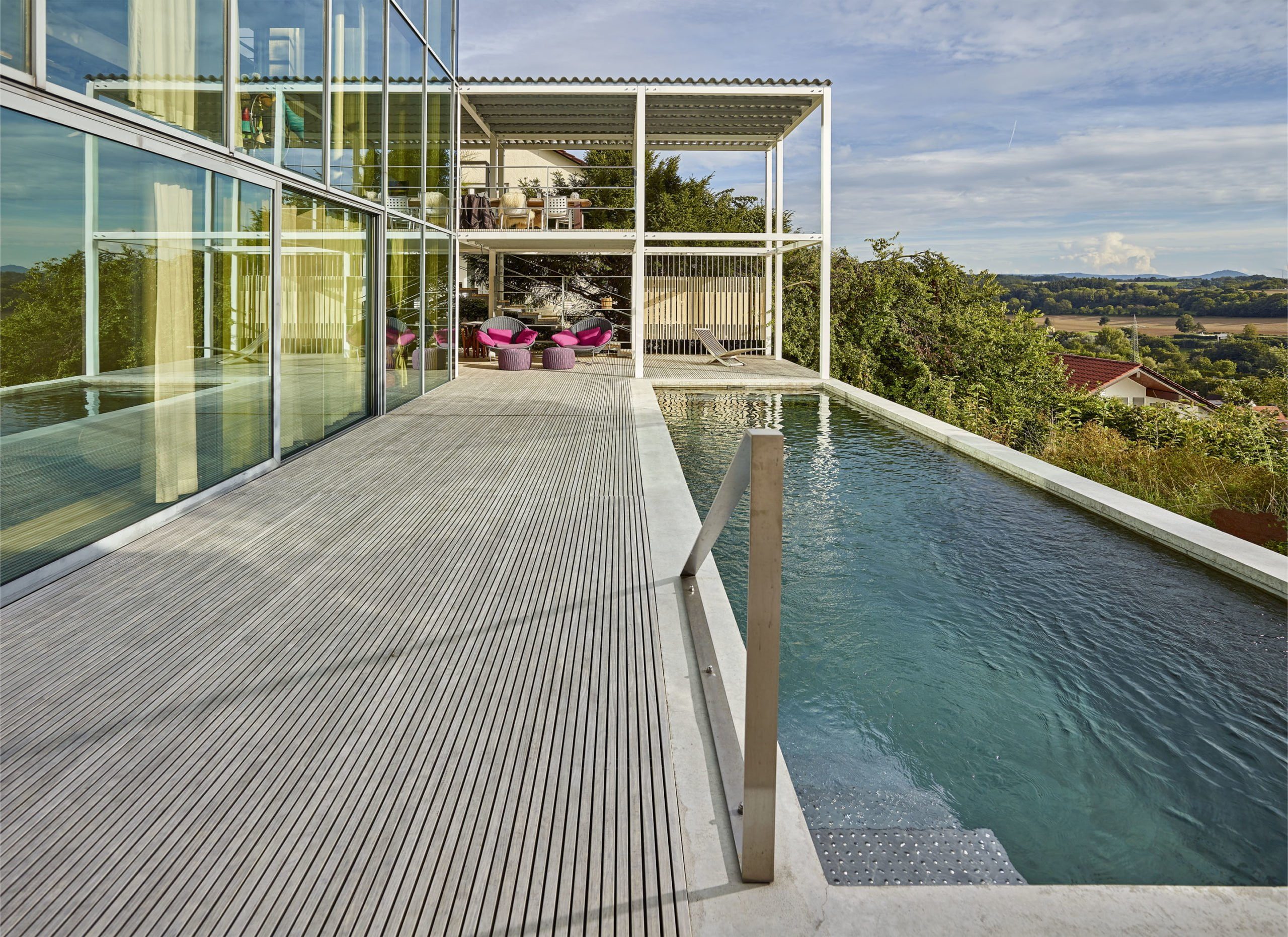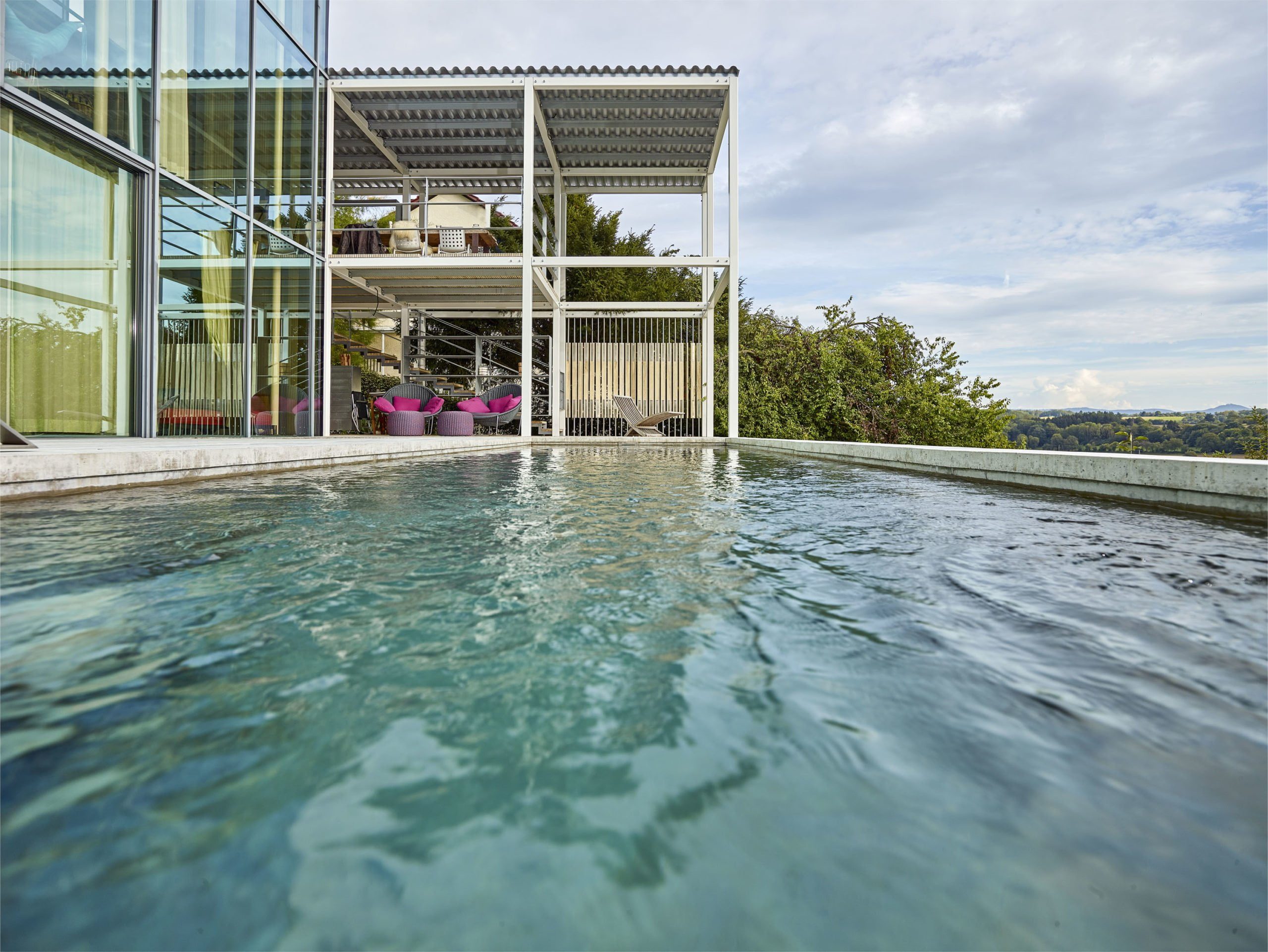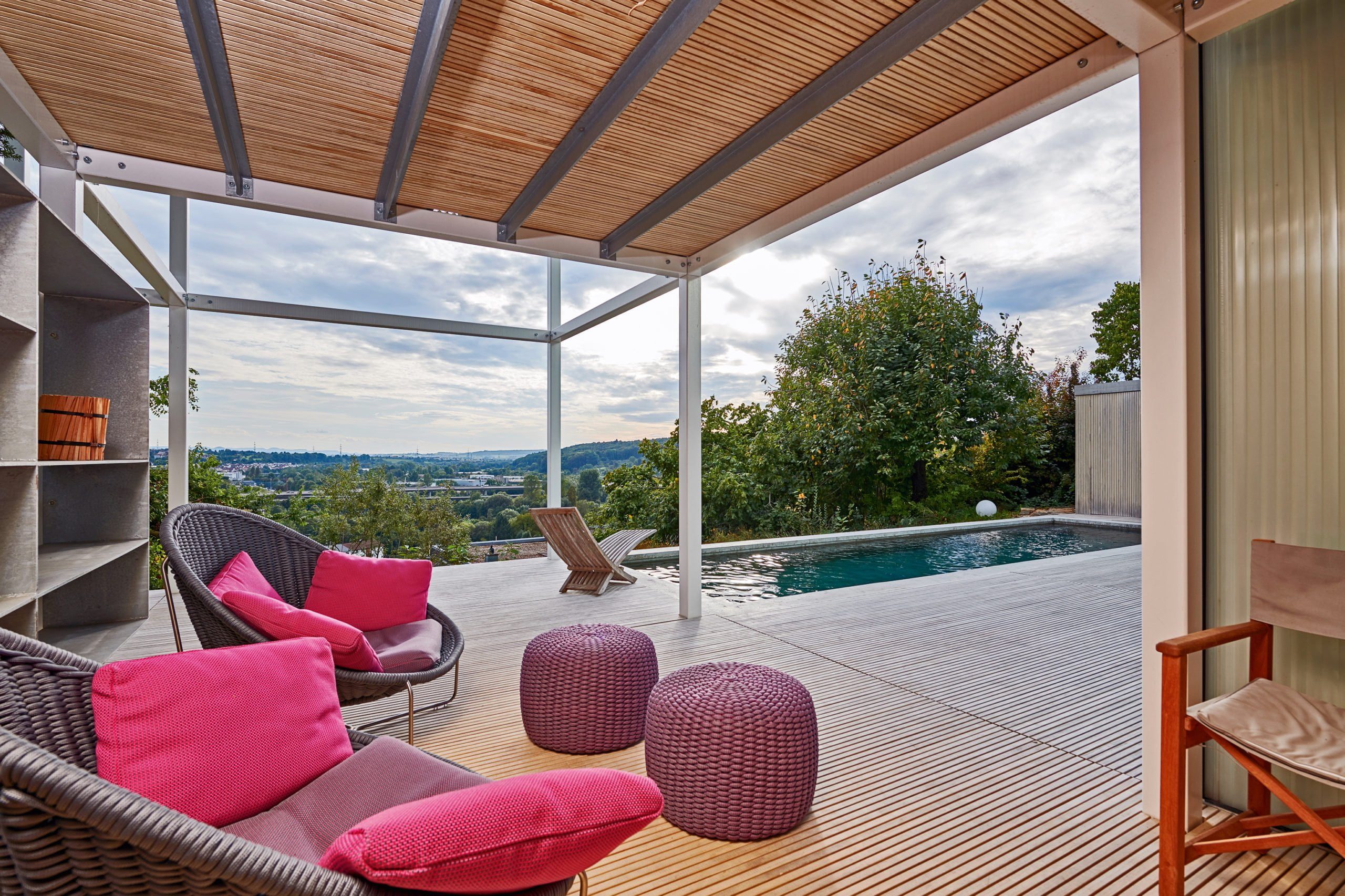 Andererseits sind unerwünschte Blicke von Außen hier nicht möglich: maximale Aussicht bei maximaler Privatsphäre. Und ein idealer Standort für den neuen Swimmingpool. Die Hausbesitzer – eine Familie mit Kind – ließ ihn mit einem seitlichen Anbau zeitgleich ans Gebäude erstellen.