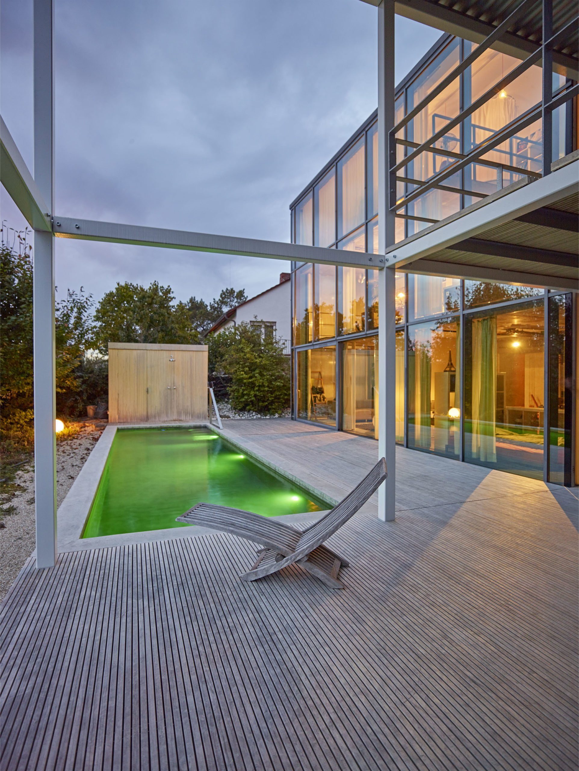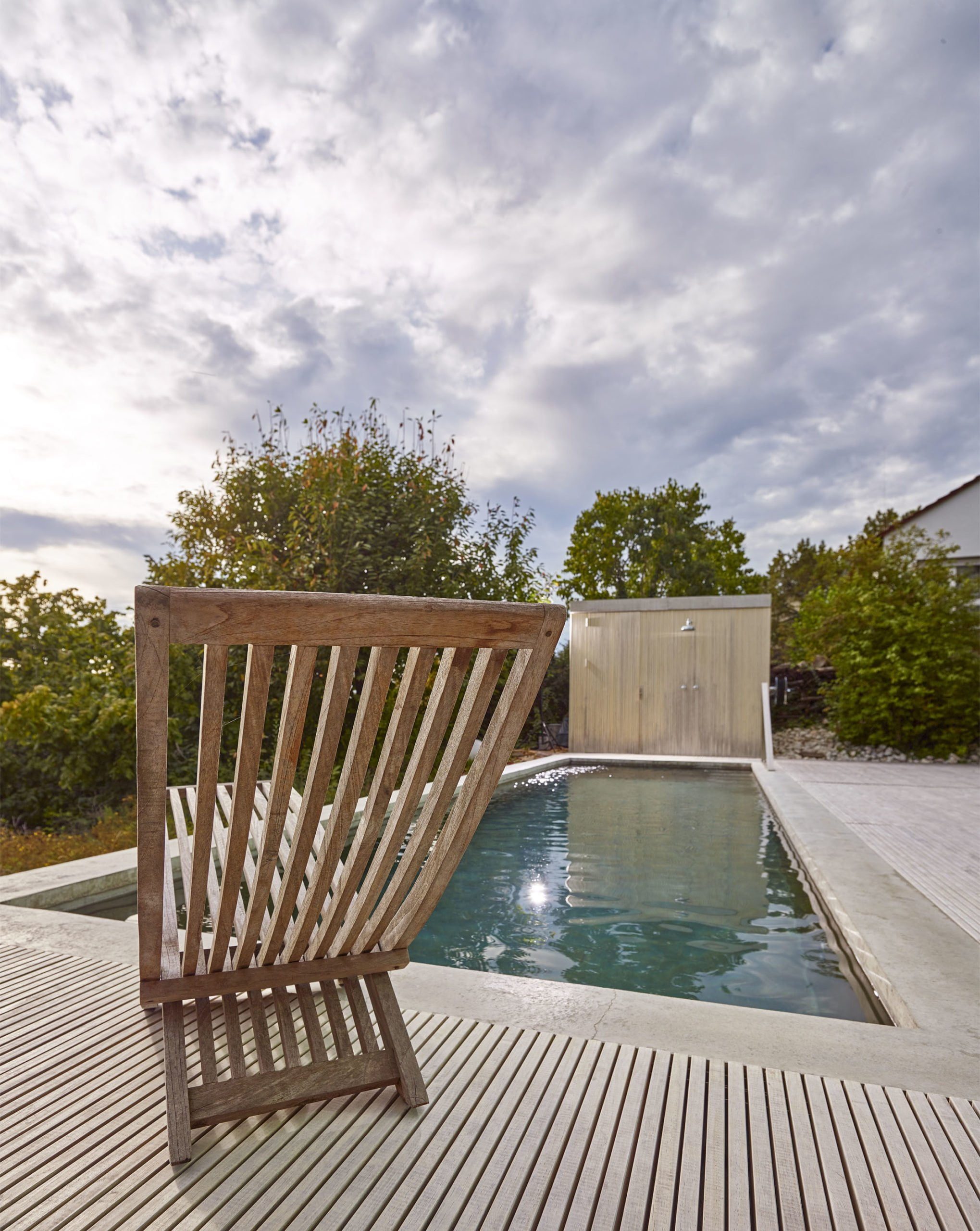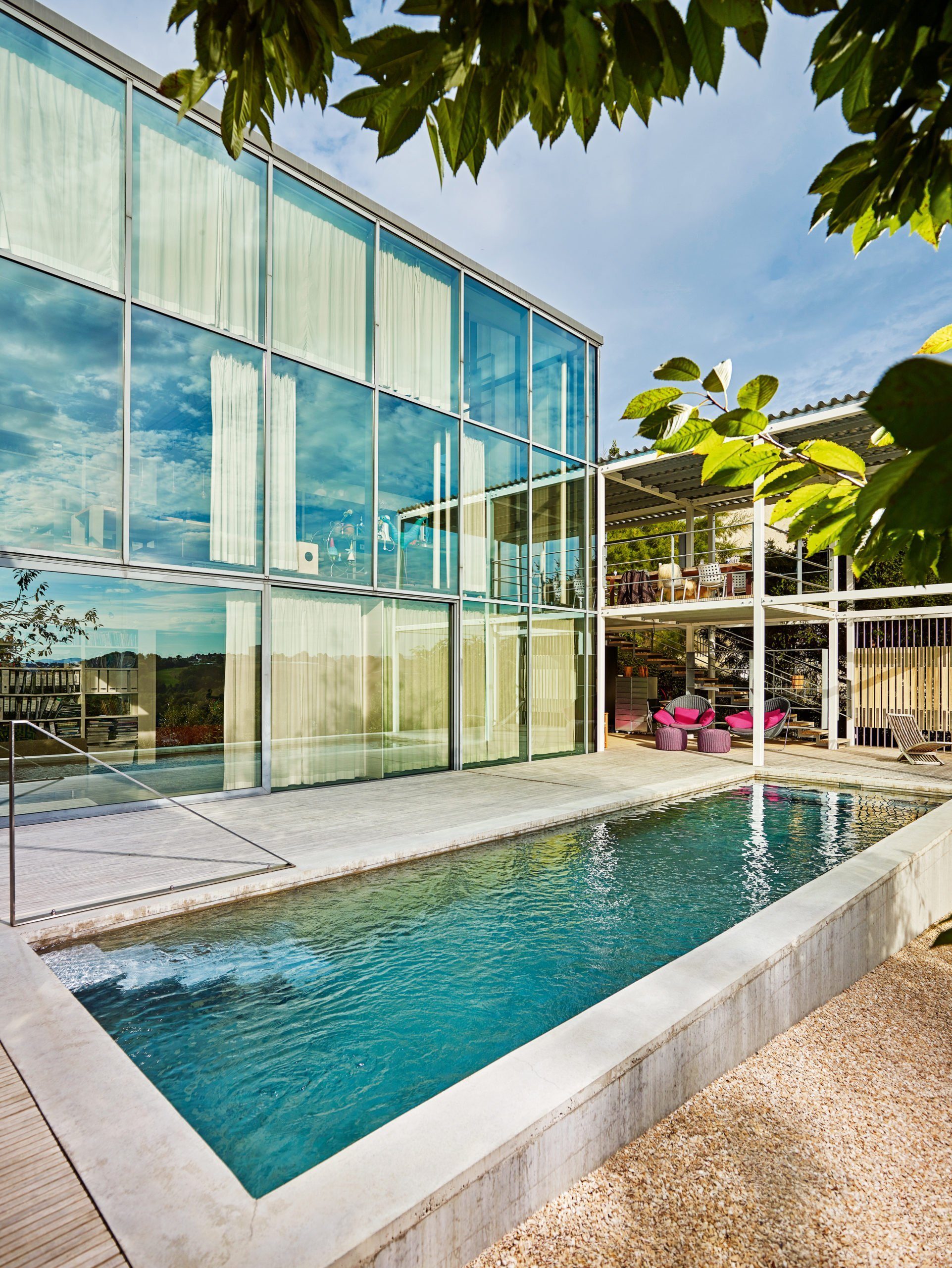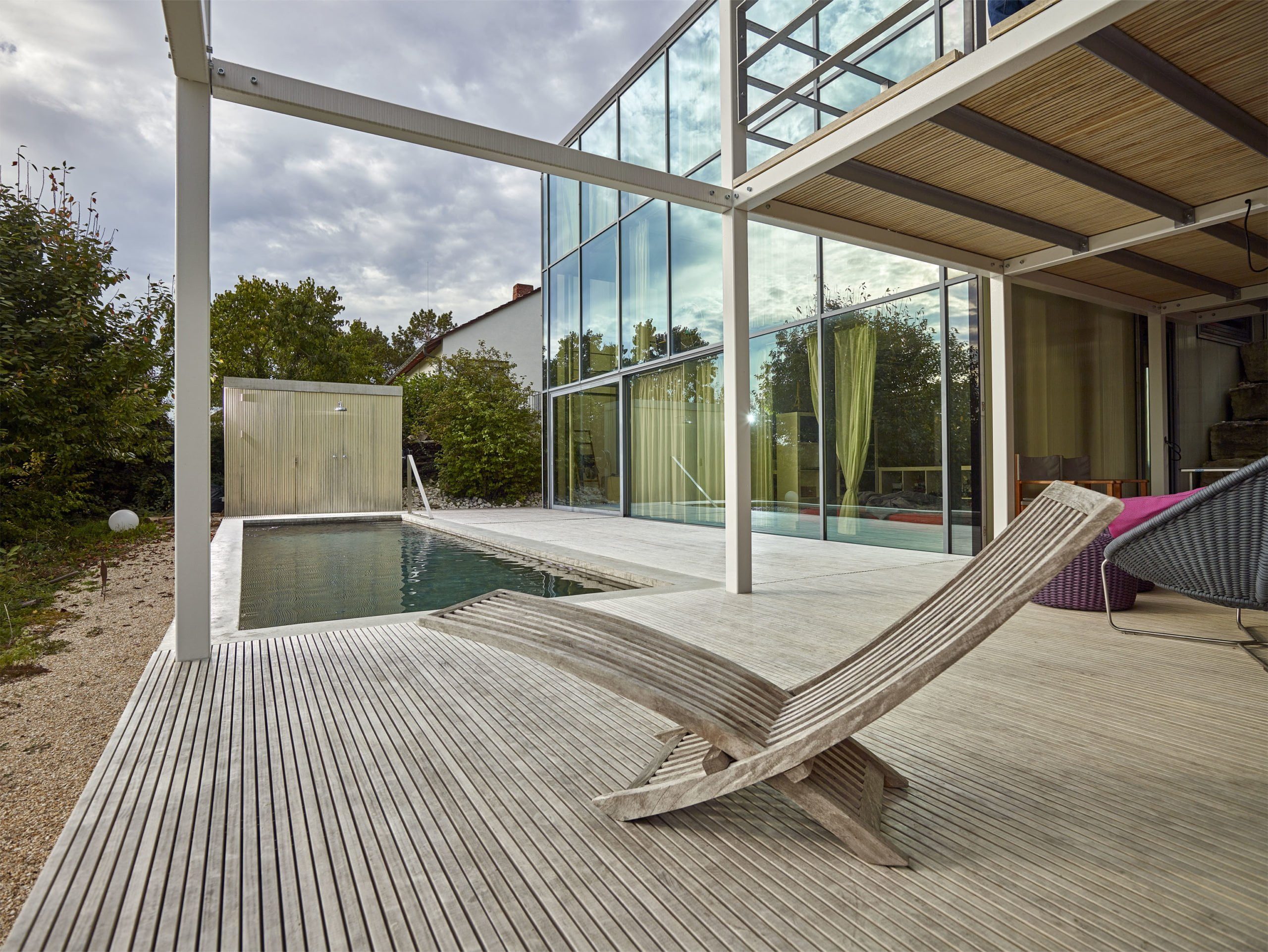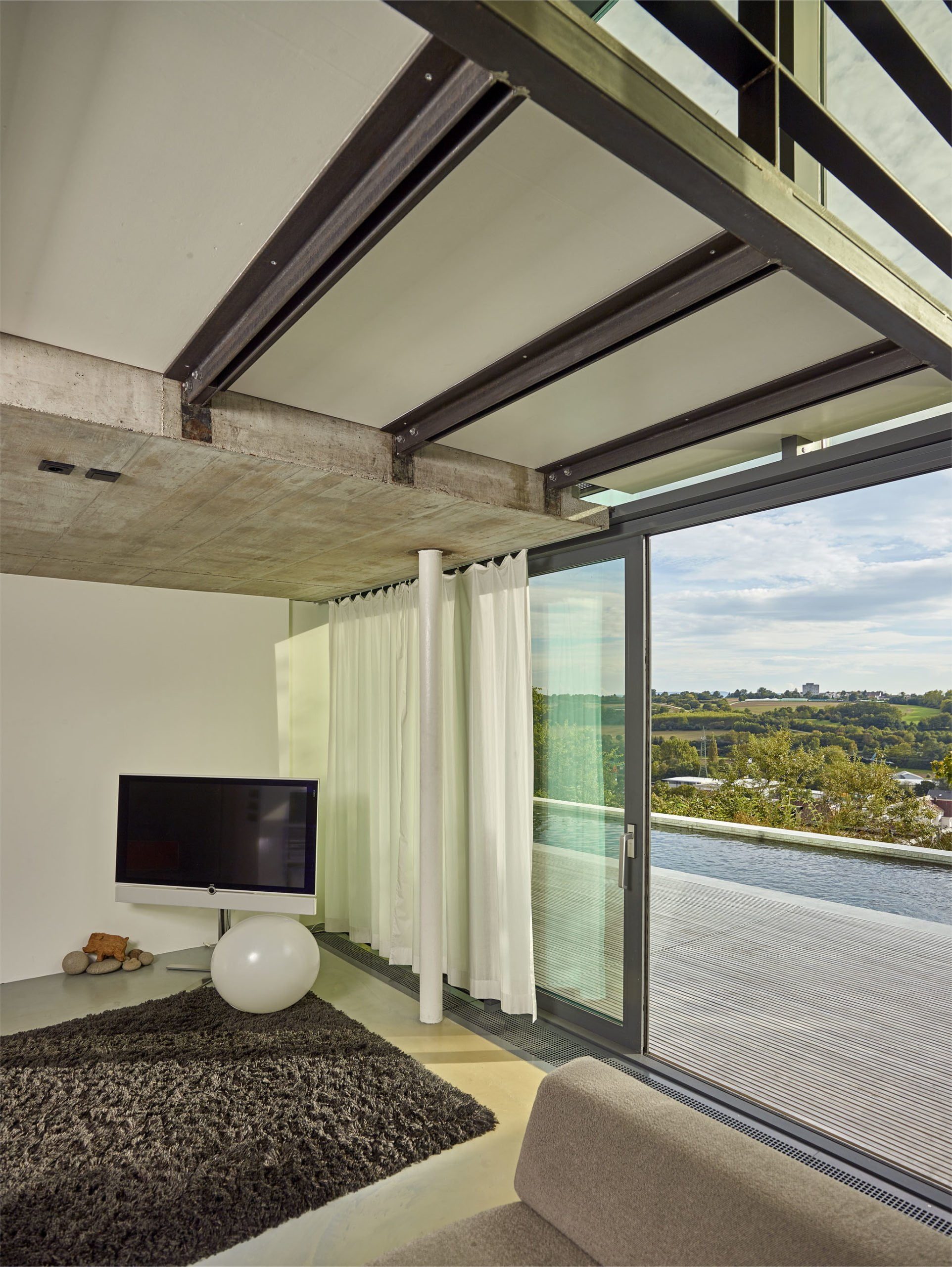 Andererseits sind unerwünschte Blicke von Außen hier nicht möglich: maximale Aussicht bei maximaler Privatsphäre. Und ein idealer Standort für den neuen Swimmingpool. Die Hausbesitzer – eine Familie mit Kind – ließ ihn mit einem seitlichen Anbau zeitgleich ans Gebäude erstellen.