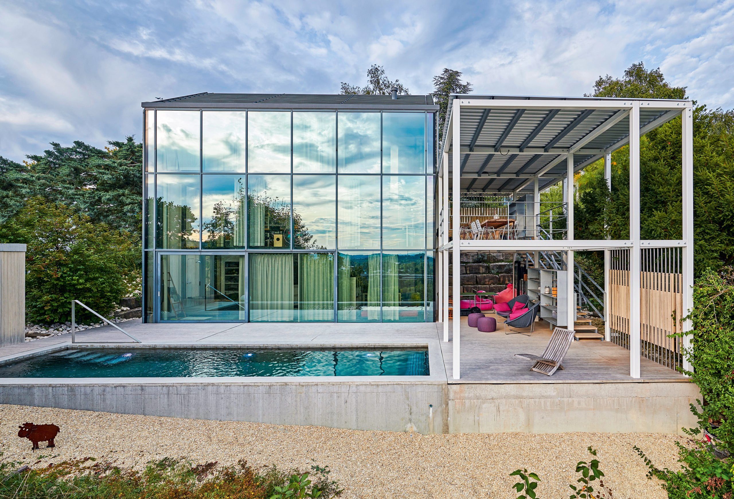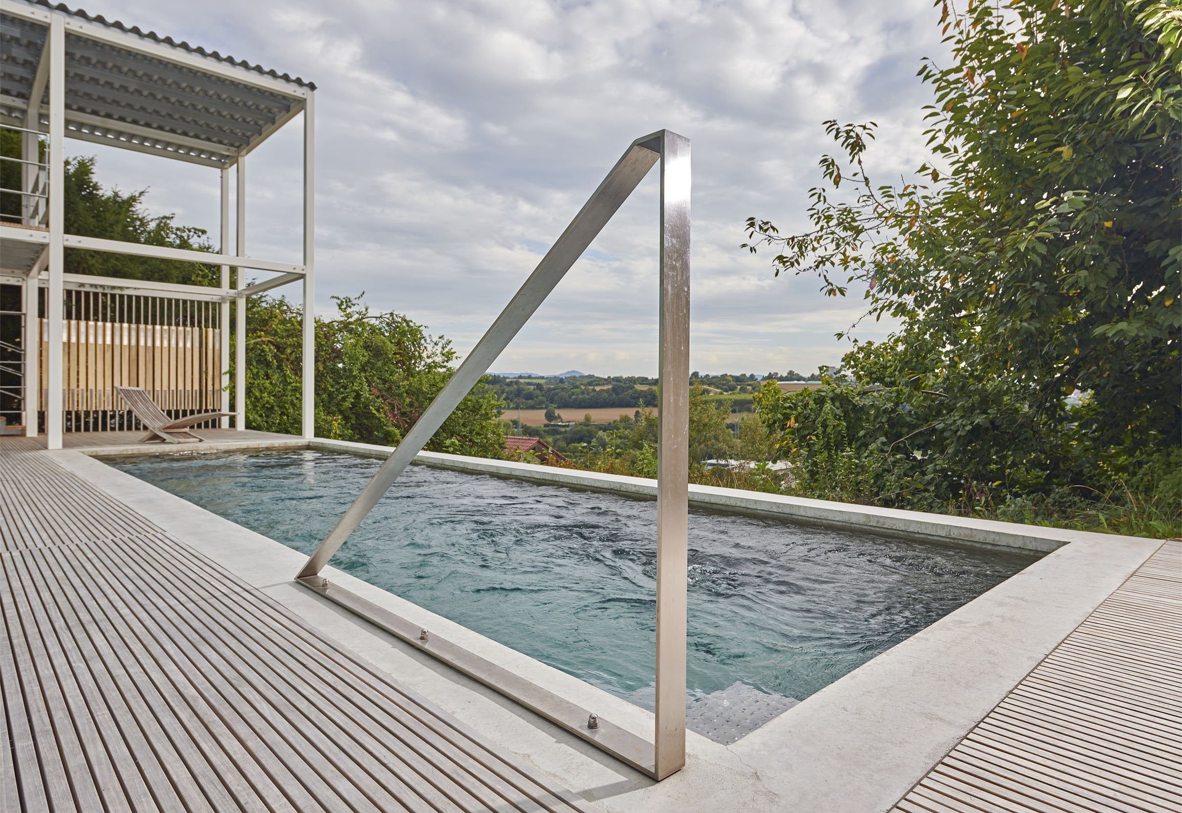 Drei Elemente: Das bestehende Wohnhaus, die zweistöckige Aussichtslounge und der Swimmingpool bilden eine gestalterische Einheit. Zur edlen Anmutung trägt auch die Wahl der Materialien bei: Holz für die Terrasse und der optisch und haptisch überzeugende Beton für den Swimmingpool.