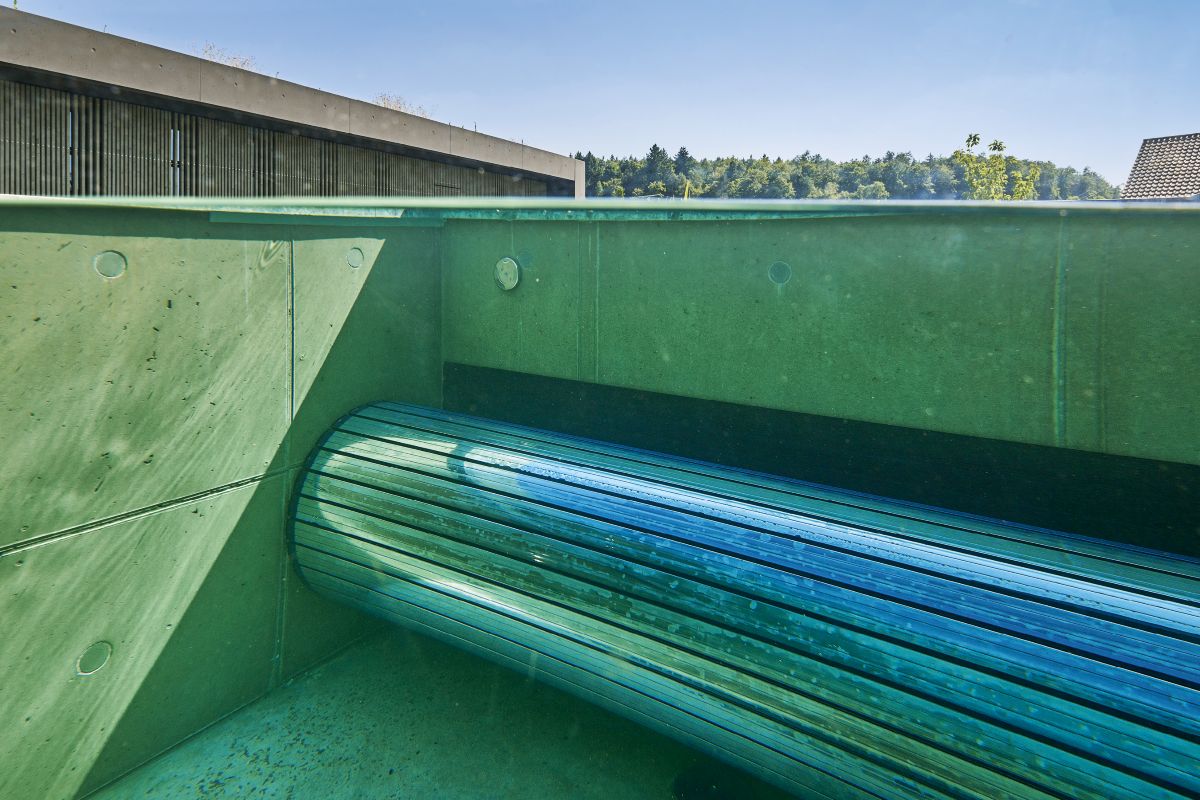 - Energieeffizienz: Poolwassererwärmung durch Hausheizung (Wärmepumpe in Verbindung mit Photovoltaikanlage) • Unterflur-Schwimmbeckenabdeckung mit Polycarbonat-Solarlamellen