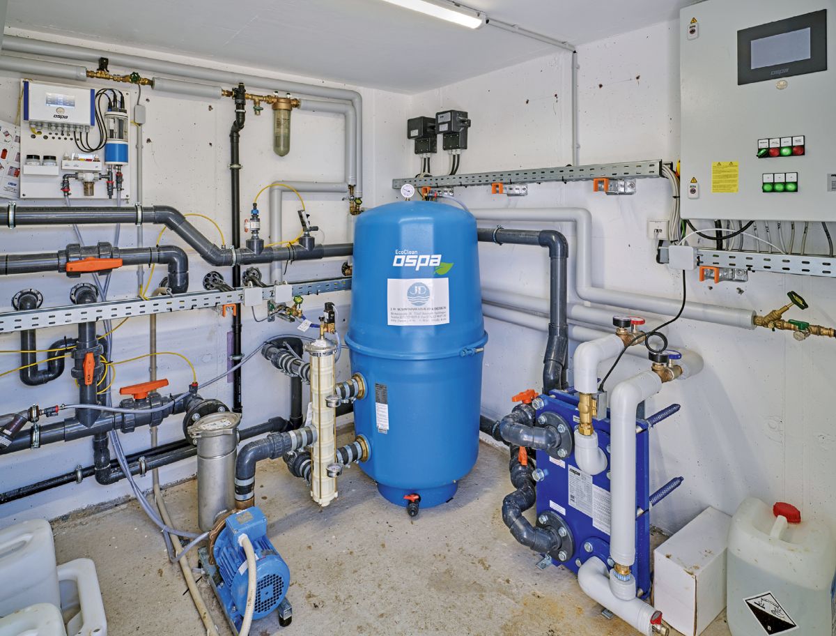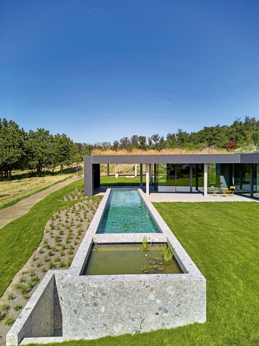 Für den Bau des Pools mit seiner ungewöhnlichen Gestaltung wählten Architekt und Bauherr die J.D. Schwimmbad-Bau & Design. „Wir können nicht nur Standardbecken, sondern sind – gerade wenn es individuell werden soll wie bei diesem besonders schönen Projekt – der richtige Partner“, betont Geschäftsführer Matthias Duhnke. Eine besondere Herausforderung stellte die Tatsache dar, so Matthias Duhnke, „dass der Pool nicht komplett in die Erde eingelassen ist. Dadurch muss man alles sehr gut planen. Das ist eine Besonderheit von uns.“ Bei diesem Projekt wurde ein kleiner Flachwasserteich an den Pool angedockt. Darunter wurde der über eine Außentreppe zugängliche Raum für die Pooltechnik untergebracht. Durch diese Lage der Technik ist eine kurze verdeckte Leitungsführung möglich.