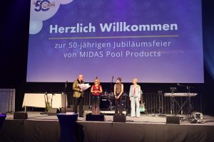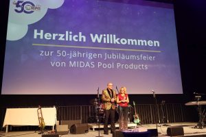 In einem emotionalen Video vollzog man diese Geschichte nach: Wolfratshausen, Neuhof-Dorfborn, Eichenzell, der Neubau. Von vier auf 50 Mitarbeiter und mit der heutigen Perspektive weiter wachsen zu können. Viele Kunden und Lieferanten kamen mit Videobotschaften zu Wort, die zeigten dass die Midas-Slogans „Mehr als Pooltechnik“ und „Leidenschaft im Poolgeschäft“ im Unternehmen Tag für Tag gelebt werden.