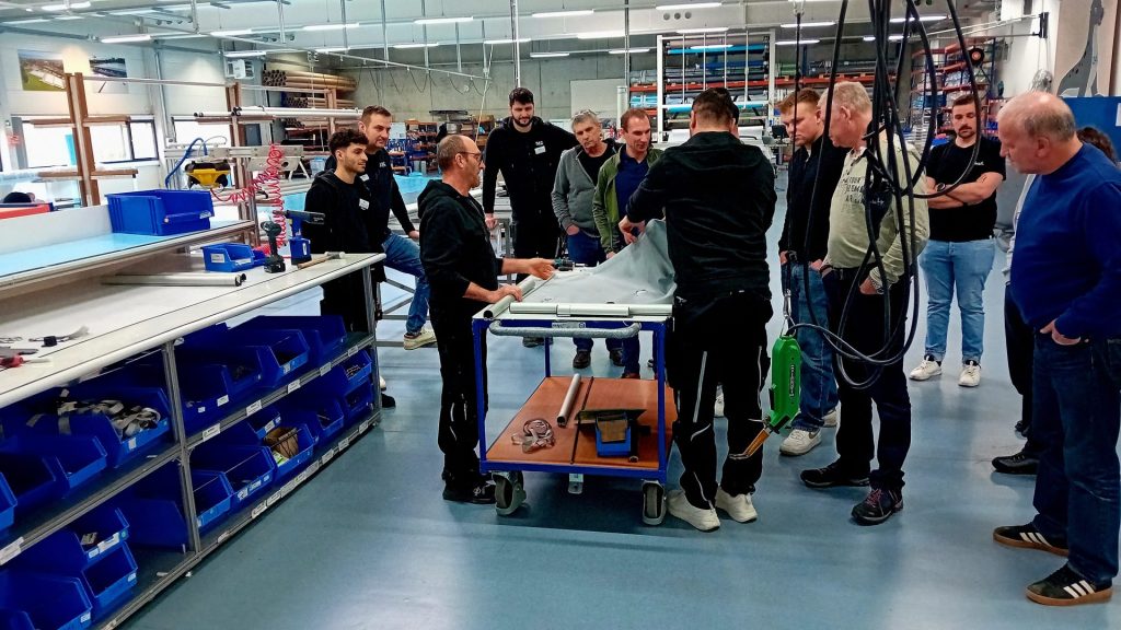 Am Vormittag noch Kennzahlen, Normen, Energieeffizienz. Am Nachmittag stehen die Teilnehmer zwischen Zuschnitt, Näherei und Montage. Material wird angefasst, Quetschrohre erklärt, Befestigungen getestet. Man spricht über Randauflagen, Sonderformen, Schneelasten. Aus Katalogen werden greifbare Systeme.