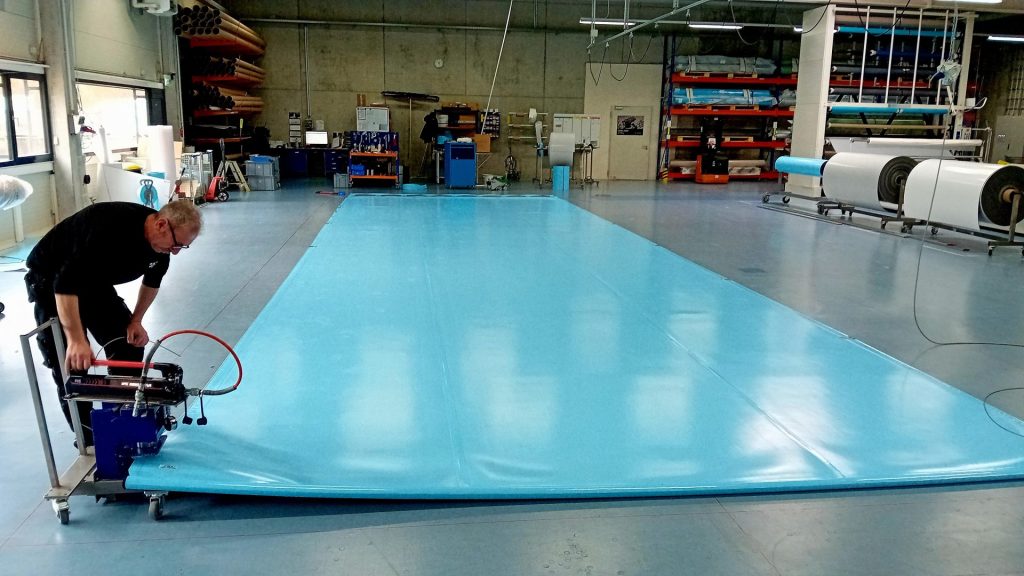 Schließlich werden die Stars des Unternehmens präsentiert. Im Schulungsraum liegen sie nebeneinander – nicht als Prospekt, sondern zum Anfassen. Novatrend, Einsteigermodell für Becken unter zehn Meter. Multiversal, Mittelklasse mit 20 Zentimeter Randauflage, geeignet für nahezu jede Beckenform sowie Swiss Top, das Premiumsegment mit 25 Zentimeter Randauflage, ohne sichtbare Zwischenstangen.