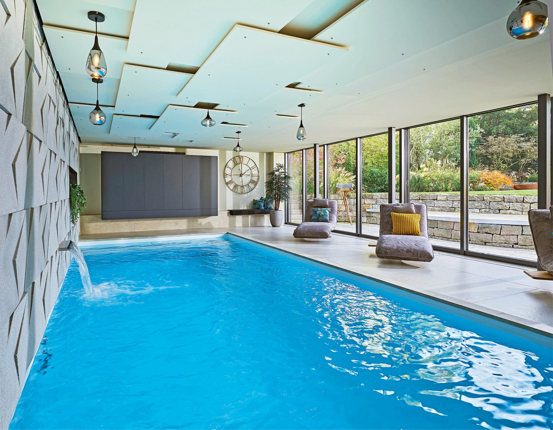 Wasserattraktionen: Gegenstromanlage von uwe „JetStream BAMBO2“, www.uwe.de • Wandwasserfall von uwe • Unterflur-Rolladenabdeckung mit PVC-Lamellen von Swimroll, www.swimroll.de