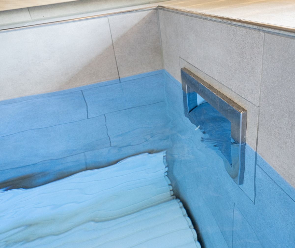 Inspirieren ließen sich die künftigen Bauherren von verschiedenen Schwimmbädern, die sie vor Ort besichtigten, und auch von Fachzeitschriften wie Schwimmbad+Sauna. Auf Empfehlung beauftragten sie schließlich Matthias Duhnke, der mit seiner Firma schon zahlreiche, auch High-End-Projekte realisiert hat. Glücksfall: Er ist gleichzeitig Geschäftsführer von Poolair, einem Hersteller modular aufgebauter Lüftungssysteme und erfahren im Implementieren dieser Technologie in vorhandene Strukturen. „Wir haben das Ganze in die Hand genommen, neue Wassertechnik und eine neue energiesparende Lüftungsanlage für ein Top-Klima integriert und unter anderem mit guter Beleuchtung und einer Gegenstromanlage aufgerüstet“, sagt Matthias Duhnke. Die Steuerung sitzt dabei ein Geschoss tiefer, im Technikraum. Elegant: Dem Expertenteam gelang es, Kanäle und sonstige Versorgungsinfrastruktur quasi unsichtbar zu integrieren. „Für uns war es wichtig, das Gestalterische mit dem Technischen in Einklang zu bringen.“